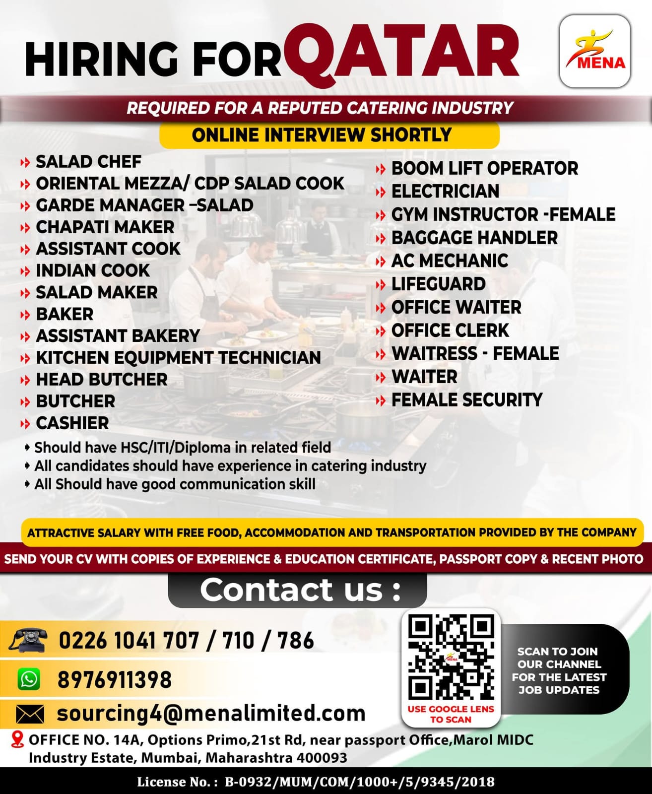 Are you looking for a catering industry job opportunity in Qatar? A reputed catering company in Qatar is hiring experienced candidates for multiple positions. Online interviews are expected to be conducted shortly. This recruitment drive offers attractive salary packages along with free food, accommodation, and transportation provided by the company. Available Job Positions Kitchen & … Read more
