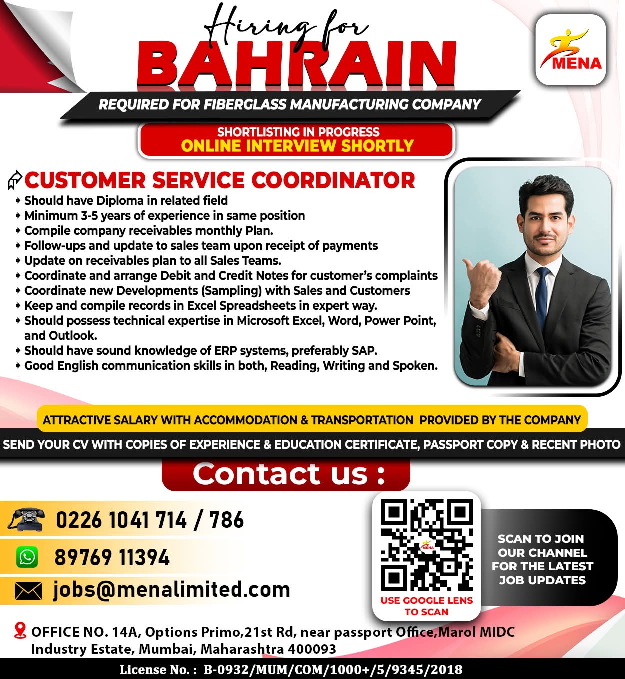 Are you looking for a Customer Service job opportunity in Bahrain? A reputed fiberglass manufacturing company is hiring experienced professionals for the role of Customer Service Coordinator. Shortlisting is currently in progress, and online interviews are expected to be conducted shortly. Bahrain’s manufacturing sector continues to grow, creating steady demand for skilled administrative and customer … Read more